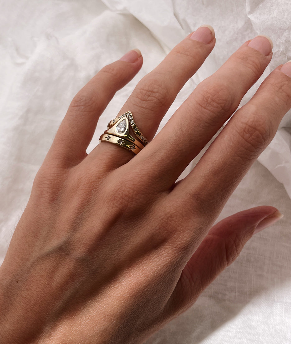 Designed to be worn alone or stacked with other rings such as the Crest ring (as pictured)