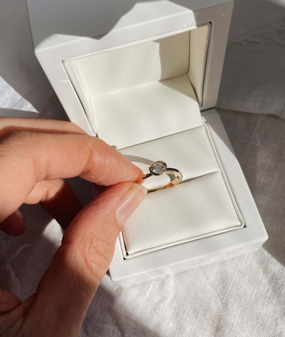 Our Pebble Solitaire Ring featuring a Bezel set 0.25ct Round Natural Diamond, hand carved and cast in solid Gold or Platinum.