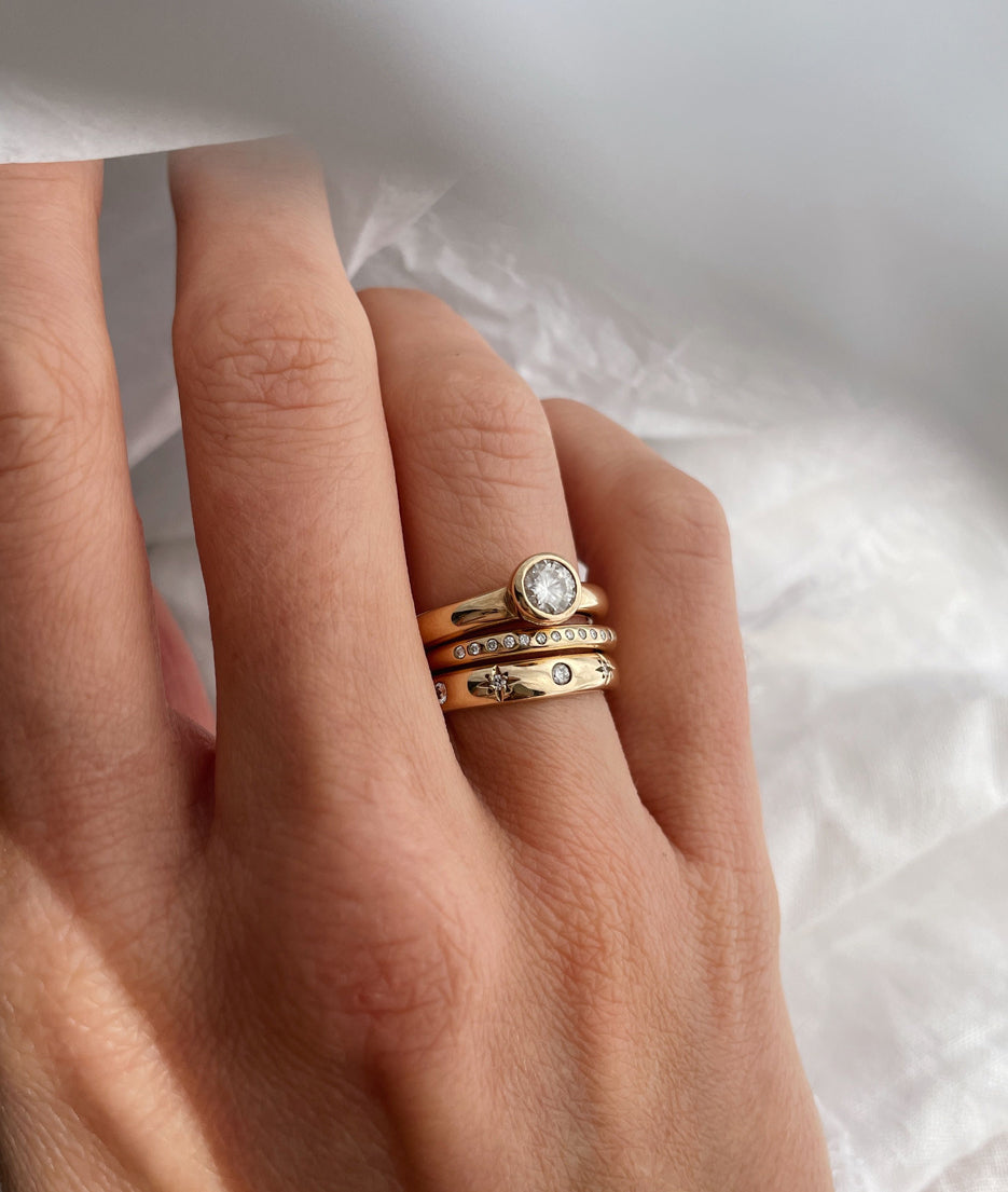 All of our pieces are made to order and we embrace and celebrate the subtle variations that make each item unique. Slight variations in band widths, thicknesses, and stone settings add to our organic style and are reflective of the hand finished nature of each piece