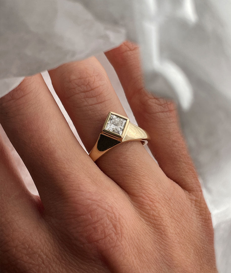 Hand carved Princess Monte ring, featuring a 0.75ct Princess cut Natural Diamond, cast in solid Gold or Platinum.