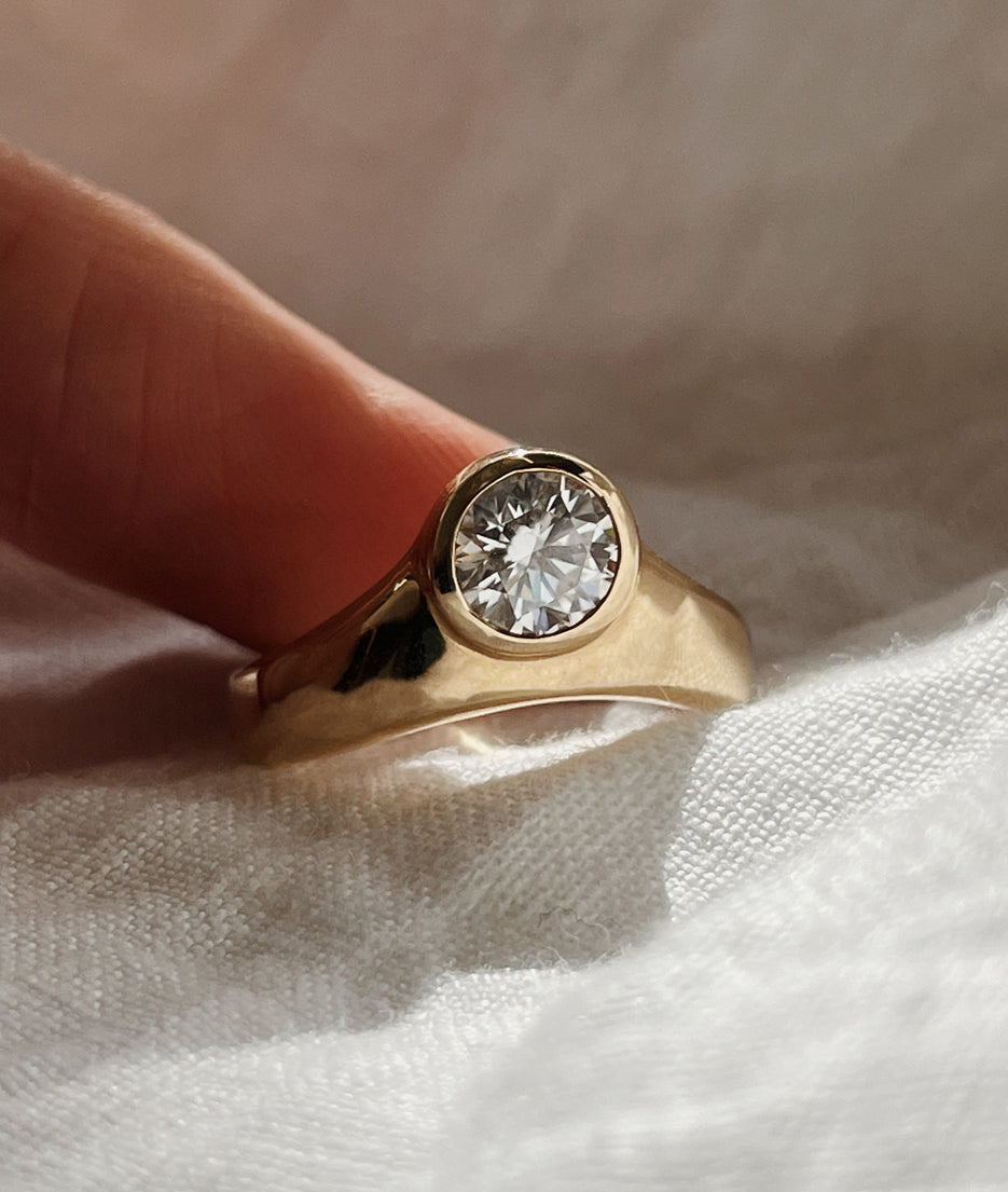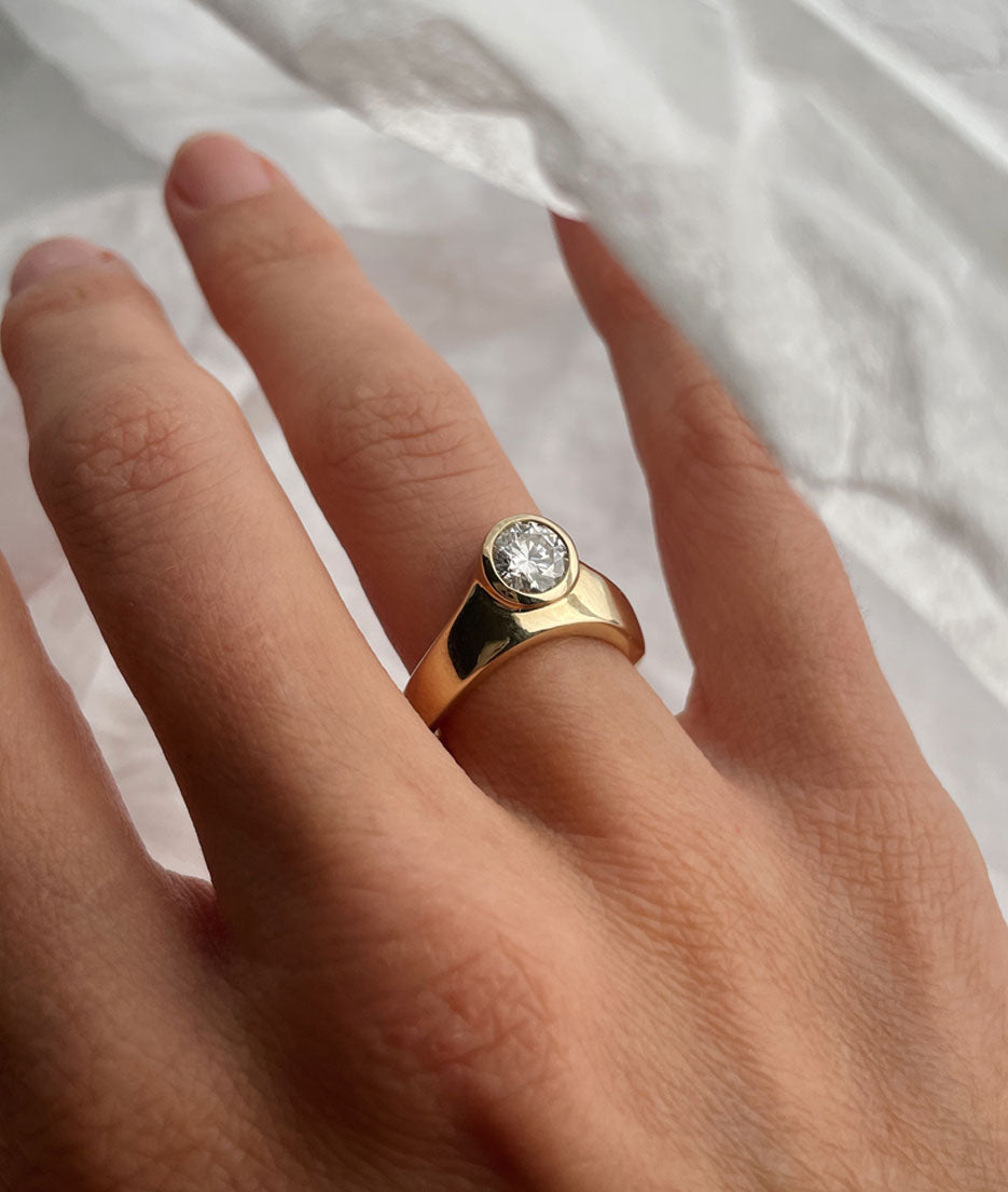 A high polished finish, the most common finish on jewellery, makes the surface of a special piece very shiny and reflective. As all of our special pieces are designed for daily wear, your ring will gain some fine little scratches over time. The mirror-like finish will wear to a natural worn finish as it develops its own patina. However, this can easily be re-polished to return your piece to its original shine.