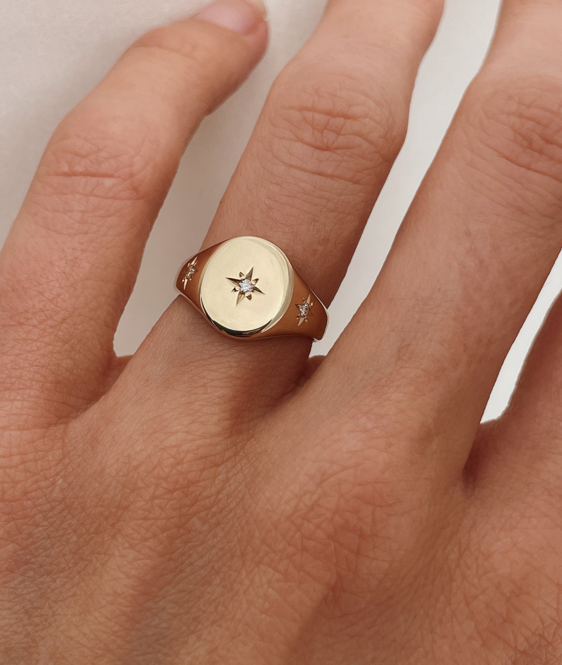 Hand carved Classic Small Signet ring cast in solid Gold, featuring 3 star-set stones of your choice.