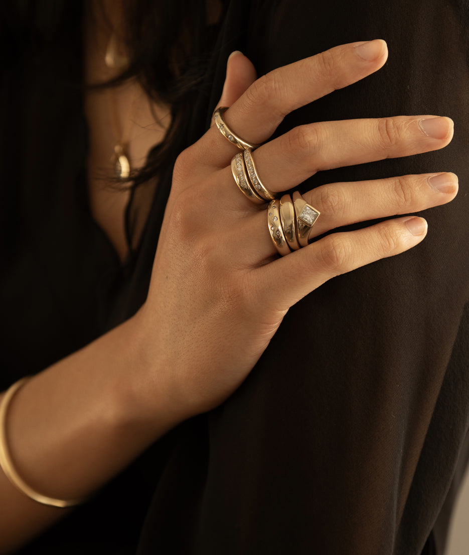 All of our pieces are made to order and we embrace and celebrate the subtle variations that make each item unique. Slight variations in band widths, thicknesses, and stone settings add to our organic style and are reflective of the hand finished nature of each piece