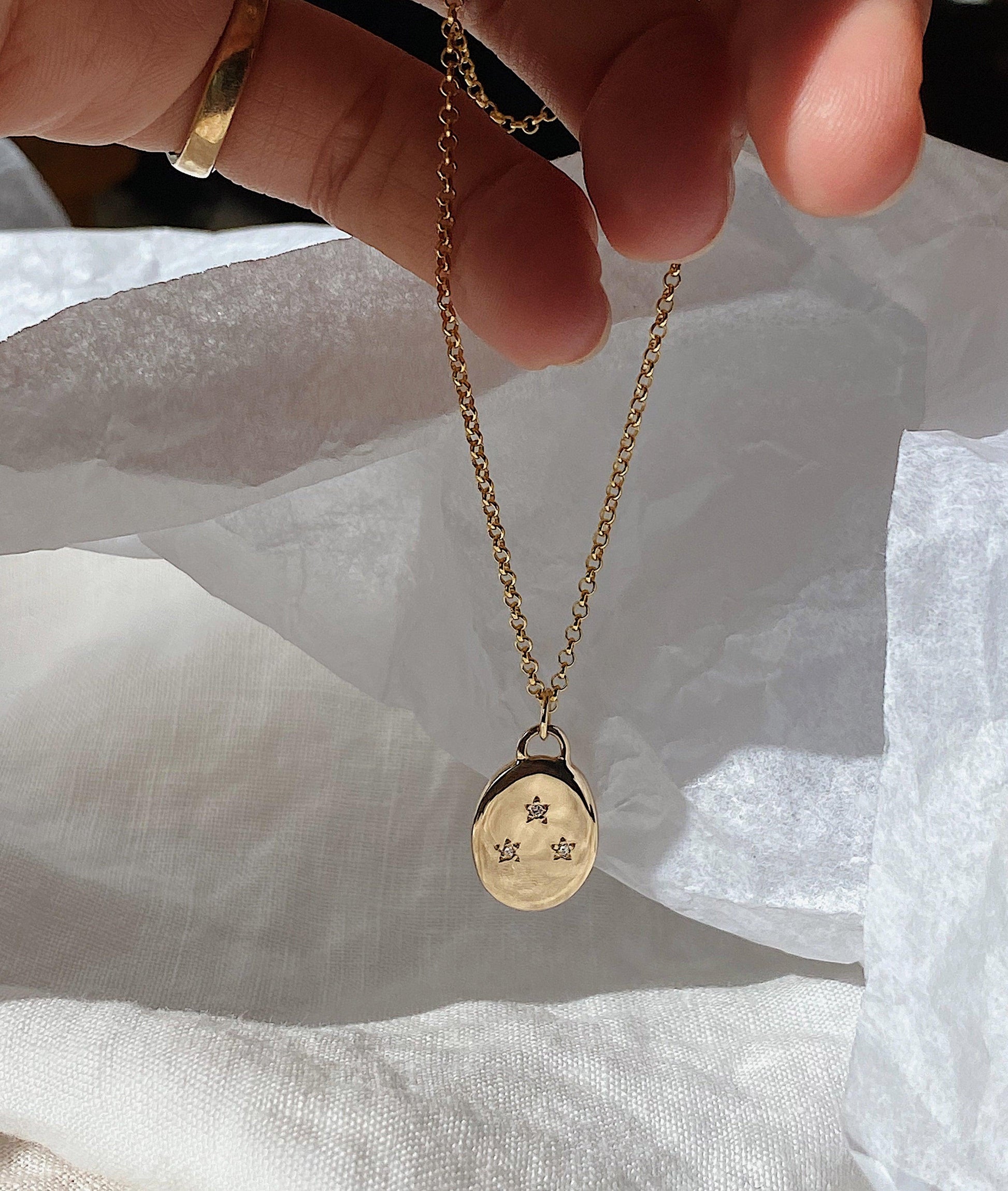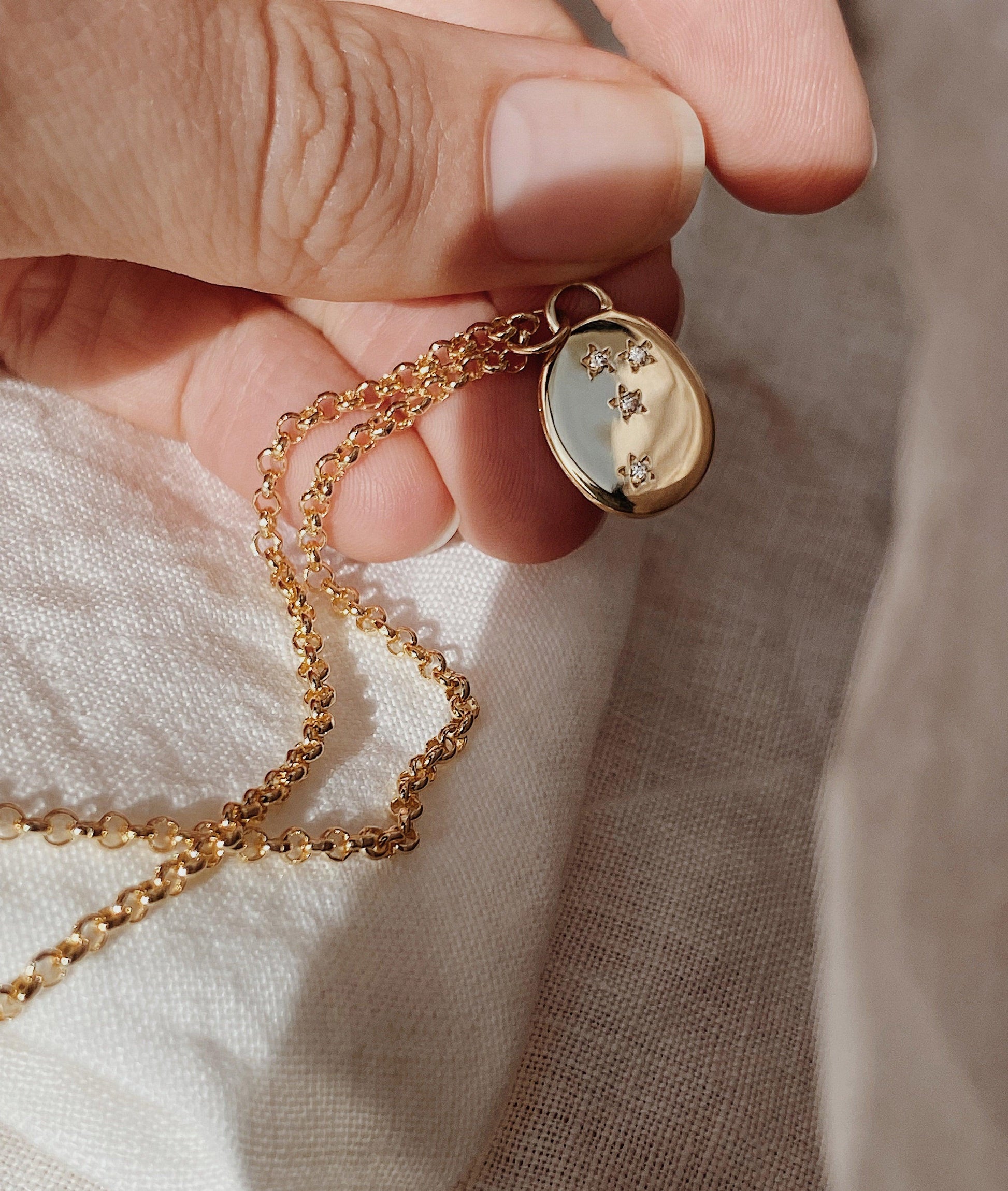 Hand carved Oval Pendant cast in solid Gold and featuring a 'sky' of constellation inspired Diamonds.