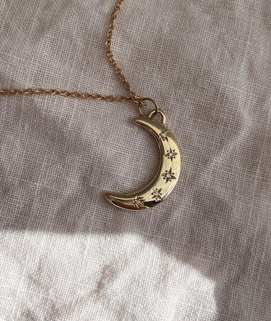 Hand carved Crescent Moon Pendant necklace, cast in solid Gold.
