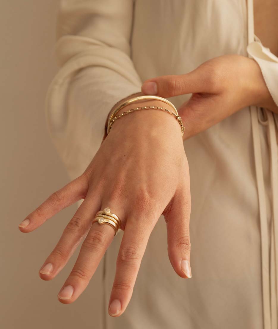 All of our pieces are made to order and we embrace and celebrate the subtle variations that make each item unique. Slight variations in band widths, thicknesses, and stone settings add to our organic style and are reflective of the hand finished nature of each piece