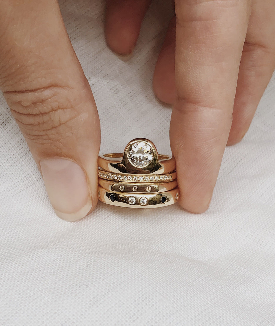 All of our pieces are made to order and we embrace and celebrate the subtle variations that make each item unique. Slight variations in band widths, thicknesses, and stone settings add to our organic style and are reflective of the hand finished nature of each piece