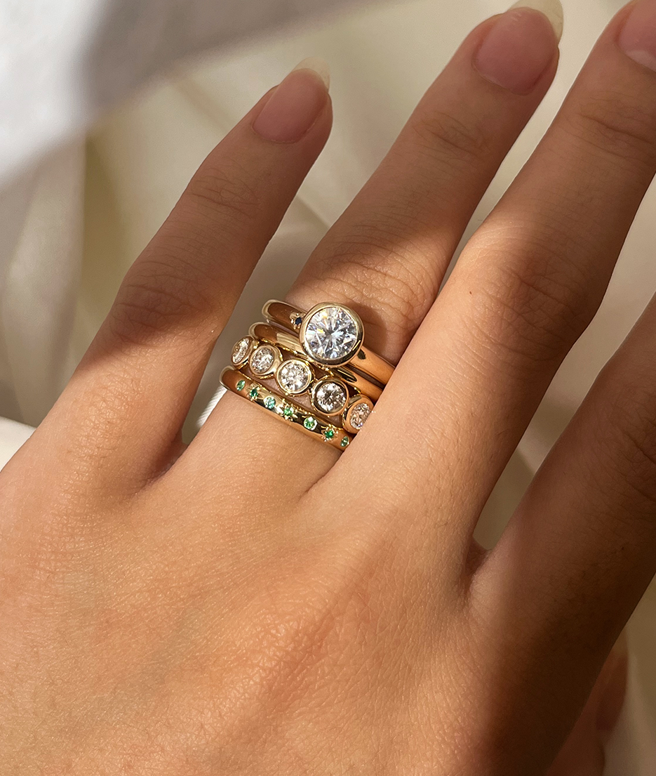 All of our pieces are made to order and we embrace and celebrate the subtle variations that make each item unique. Slight variations in band widths, thicknesses, and stone settings add to our organic style and are reflective of the hand finished nature of each piece.