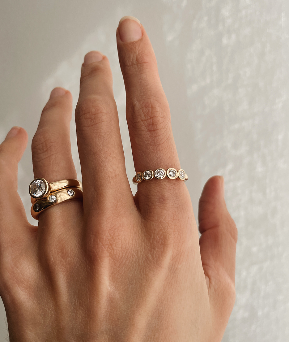All of our pieces are made to order and we embrace and celebrate the subtle variations that make each item unique. Slight variations in band widths, thicknesses, and stone settings add to our organic style and are reflective of the hand finished nature of each piece