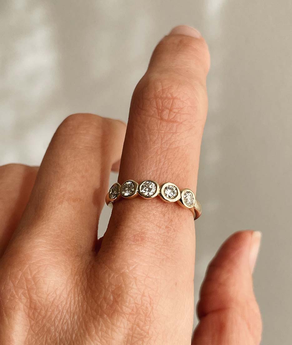 Hand carved ring featuring 5 flush set stones, cast in solid Gold or Platinum.