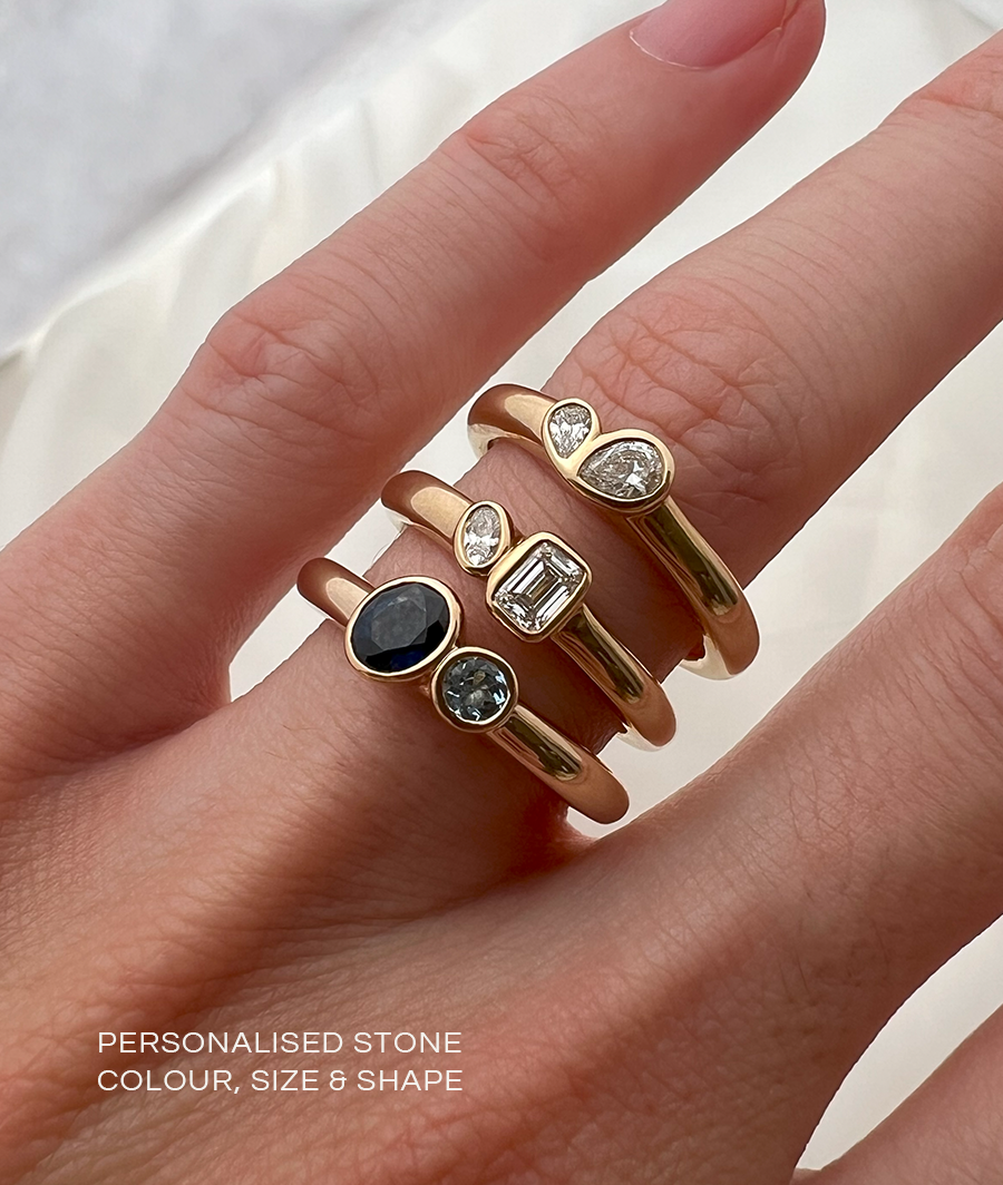 Mini Oval & Round Toi et Moi featuring a bezel set Navy Australian Oval Sapphire paired with a Round Diamond or stone of your choice, cast in solid Gold or Platinum.