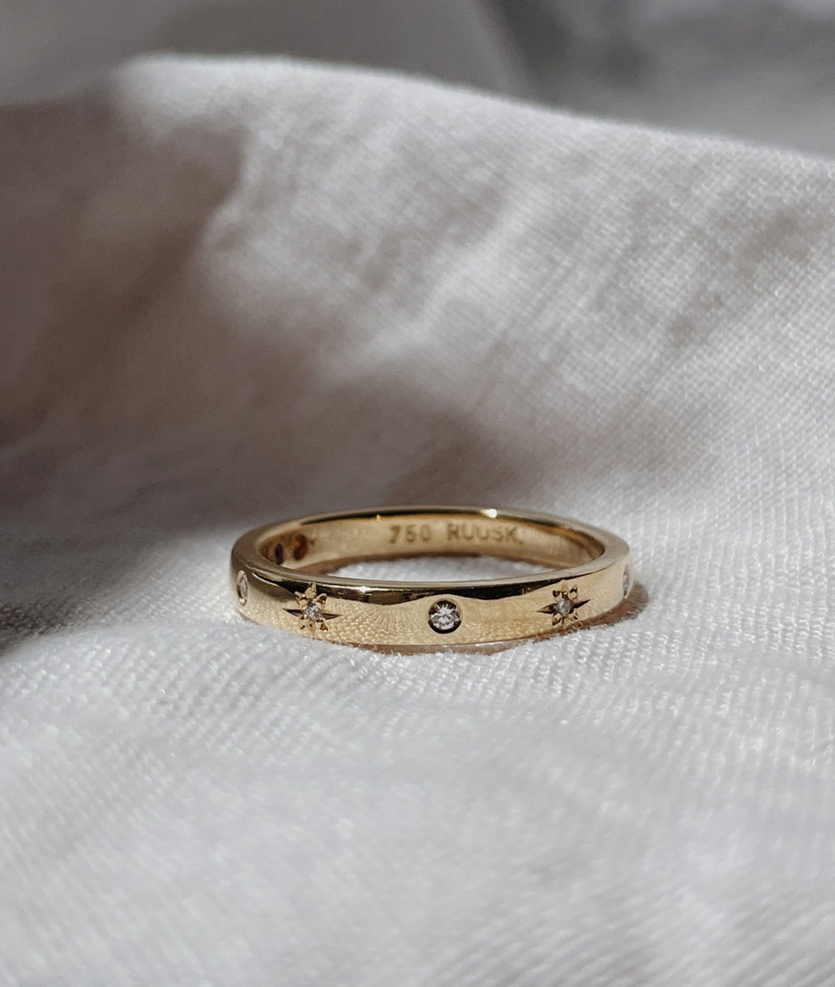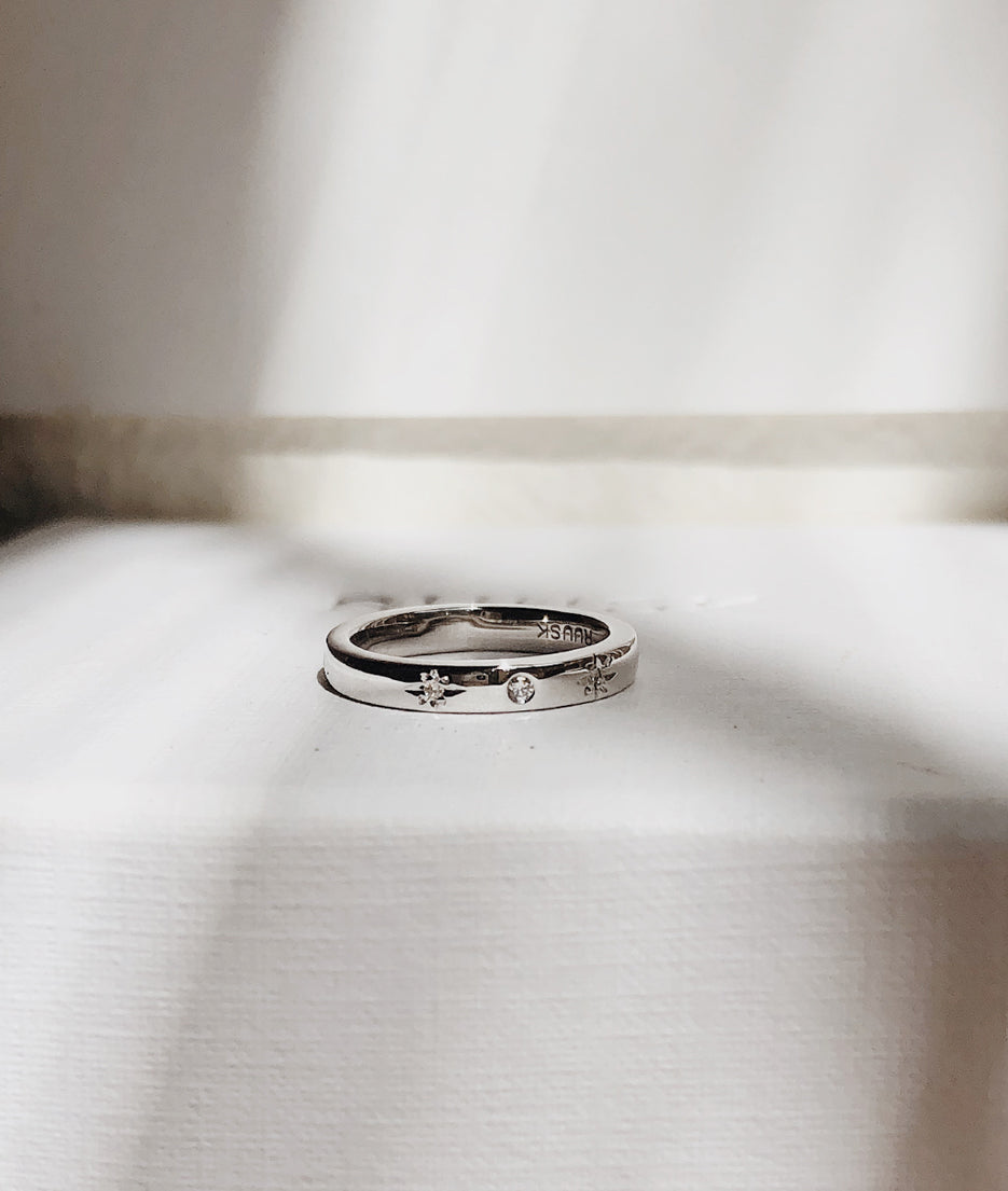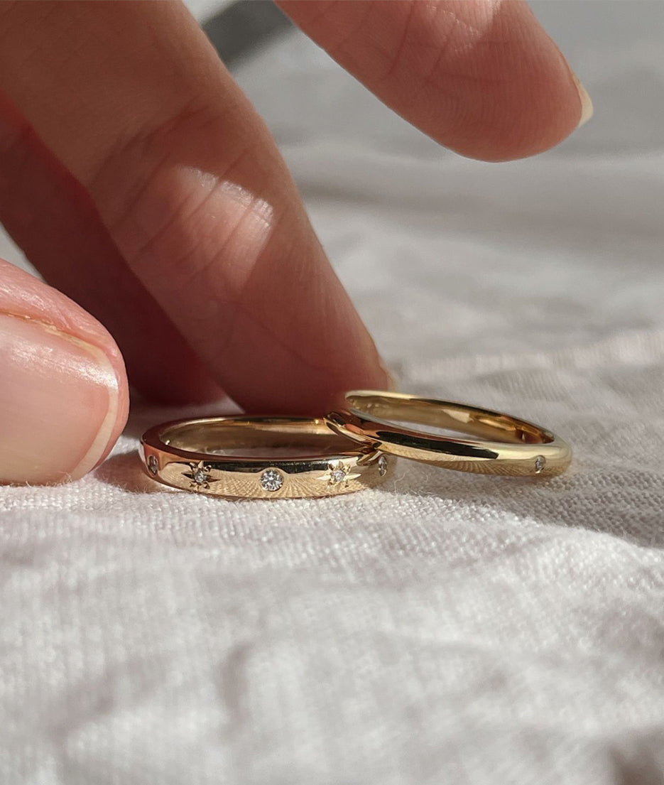 All of our pieces are made to order and we embrace and celebrate the subtle variations that make each item unique. Slight variations in band widths, thicknesses, and stone settings add to our organic style and are reflective of the hand finished nature of each piece