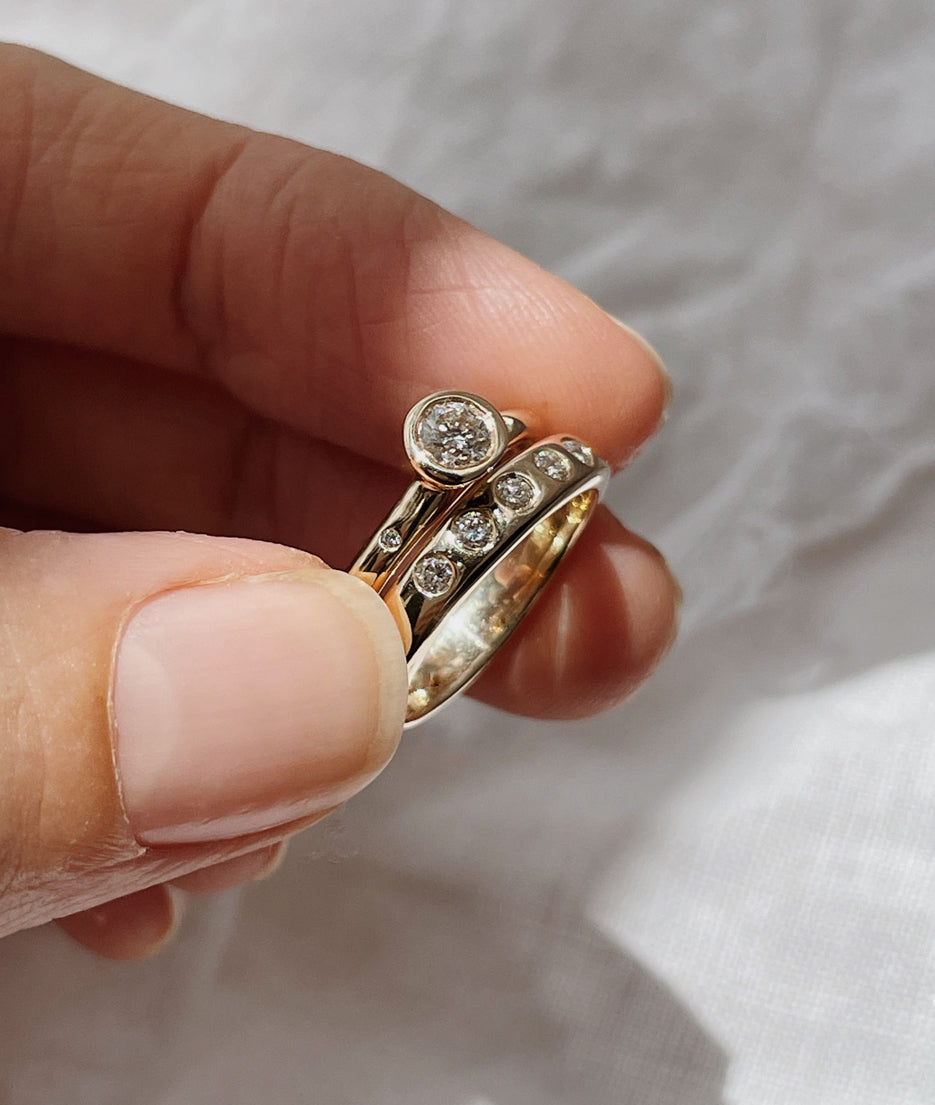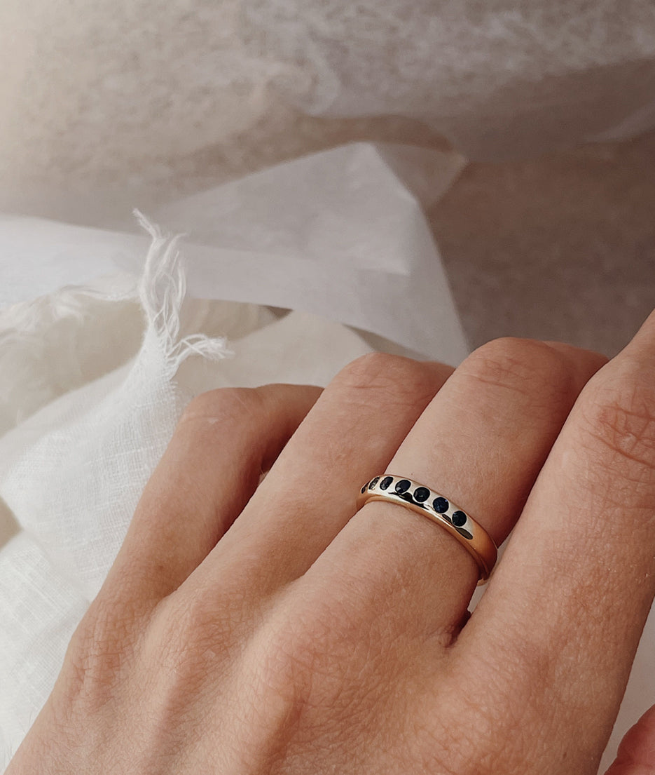 All of our pieces are made to order and we embrace and celebrate the subtle variations that make each item unique. Slight variations in band widths, thicknesses, and stone settings add to our organic style and are reflective of the hand finished nature of each piece.