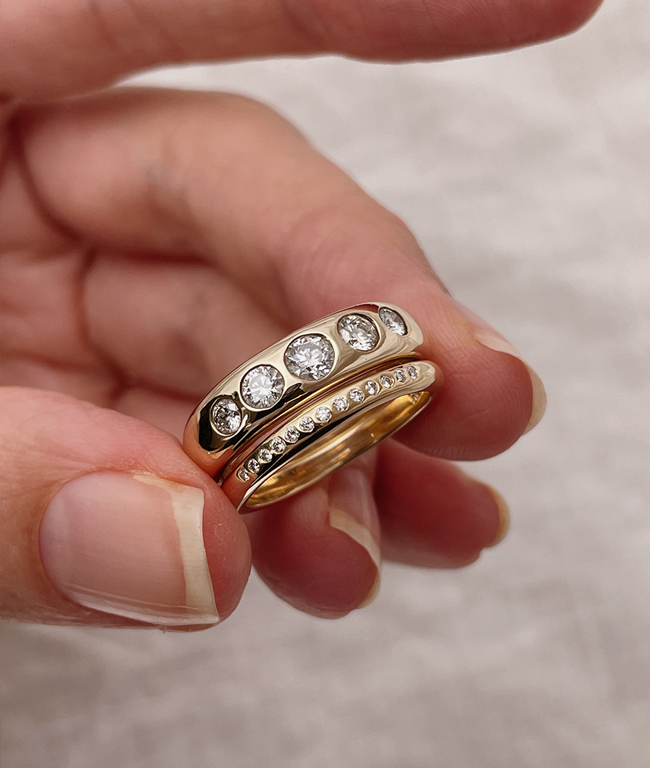 All of our pieces are made to order and we embrace and celebrate the subtle variations that make each item unique. Slight variations in band widths, thicknesses, and stone settings add to our organic style and are reflective of the hand finished nature of each piece.