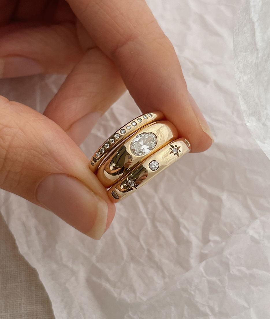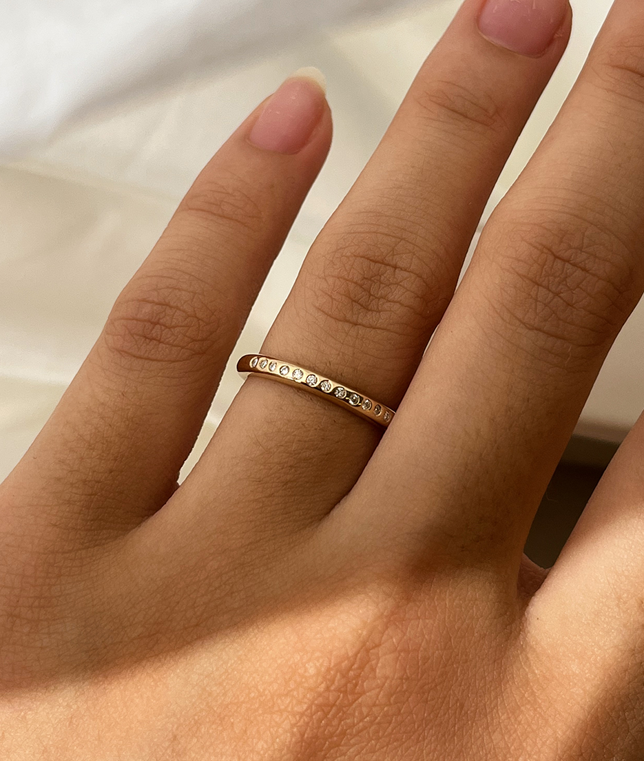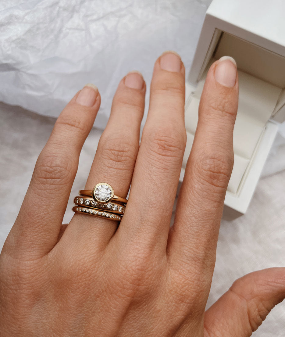 All of our pieces are made to order and we embrace and celebrate the subtle variations that make each item unique. Slight variations in band widths, thicknesses, and stone settings add to our organic style and are reflective of the hand finished nature of each piece