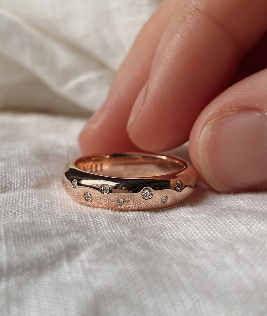 Hand carved rounded band cast in solid Gold or Platinum, featuring a small galaxy of beautiful stones.