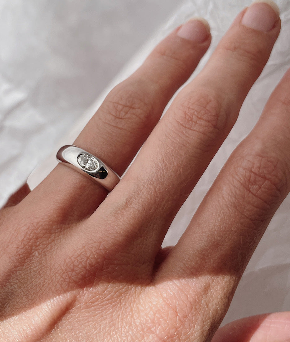 Our Wide Organic ring featuring a flush set Oval Diamond, set in an East-West orientation.