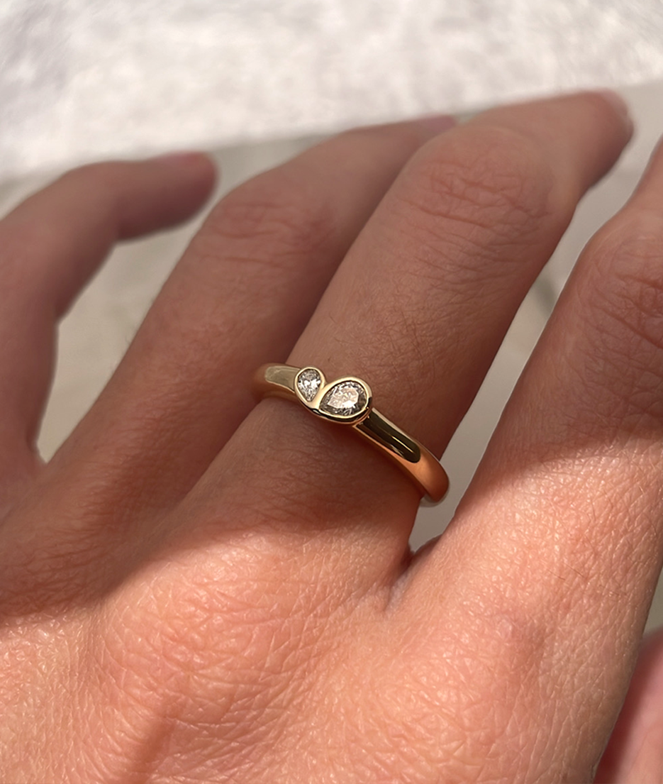 Mini Pear Toi et Moi featuring bezel set pear diamonds, cast in solid Gold or platinum.