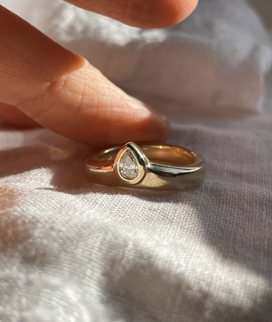 Stone: Approx. 0.25ct, 5mm x 3mm, bezel set natural F/VS Pear Diamond,