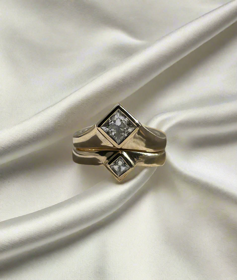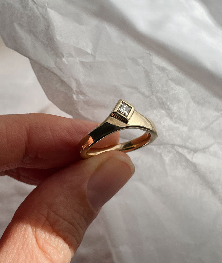Hand carved Princess Diamond Monte ring, cast in solid Gold.