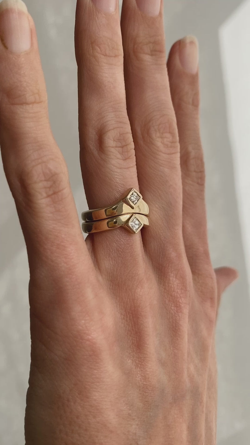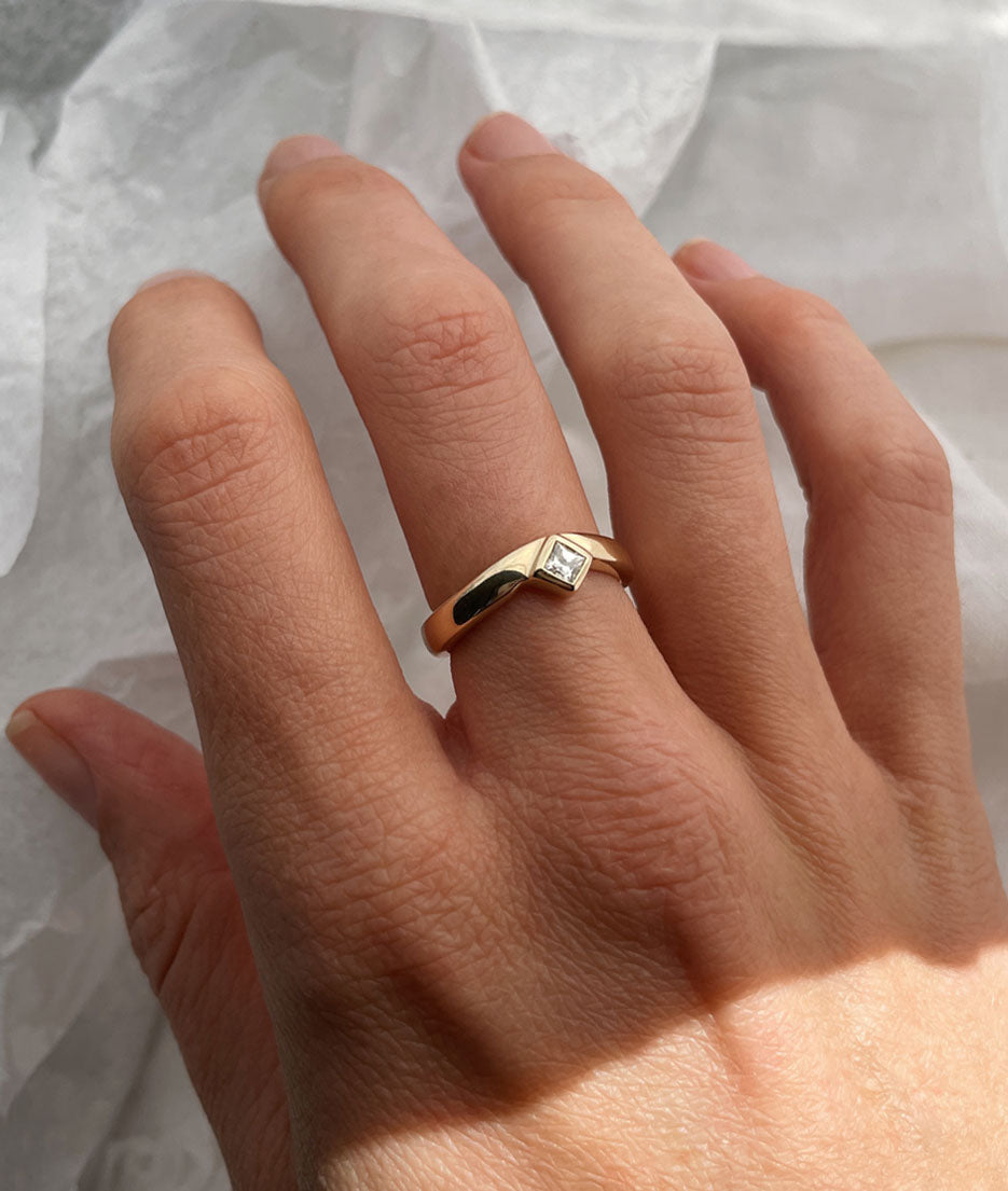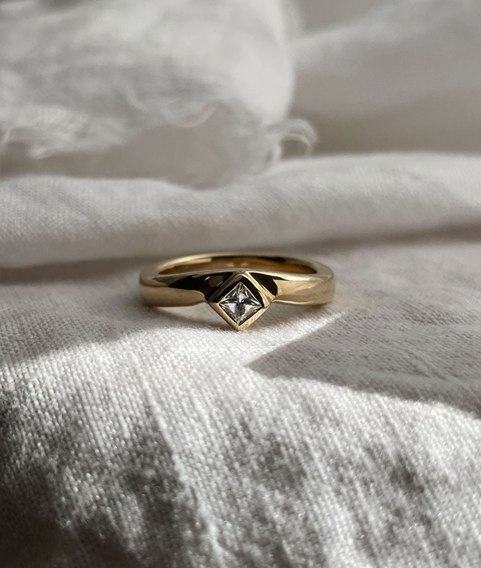 Hand carved Princess Diamond Valle ring, cast in solid Gold.