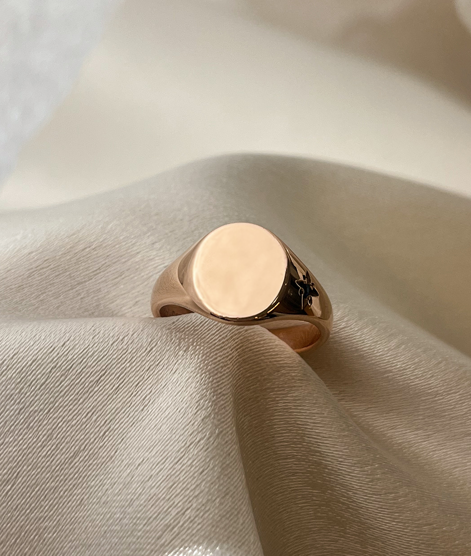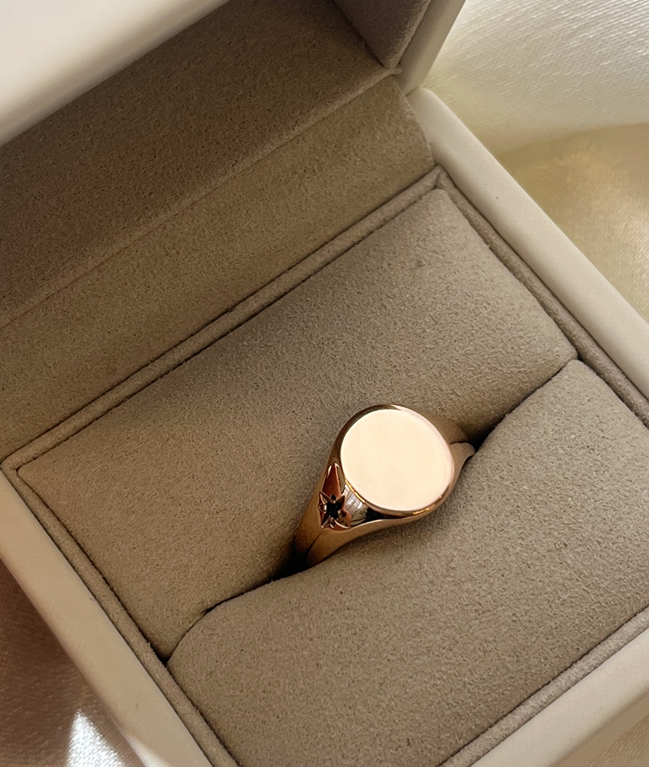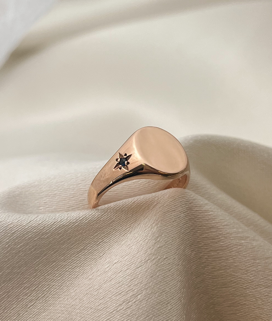 Hand carved 9ct rose gold Small Signet ring, featuring a star set sapphire on the side of the ring.