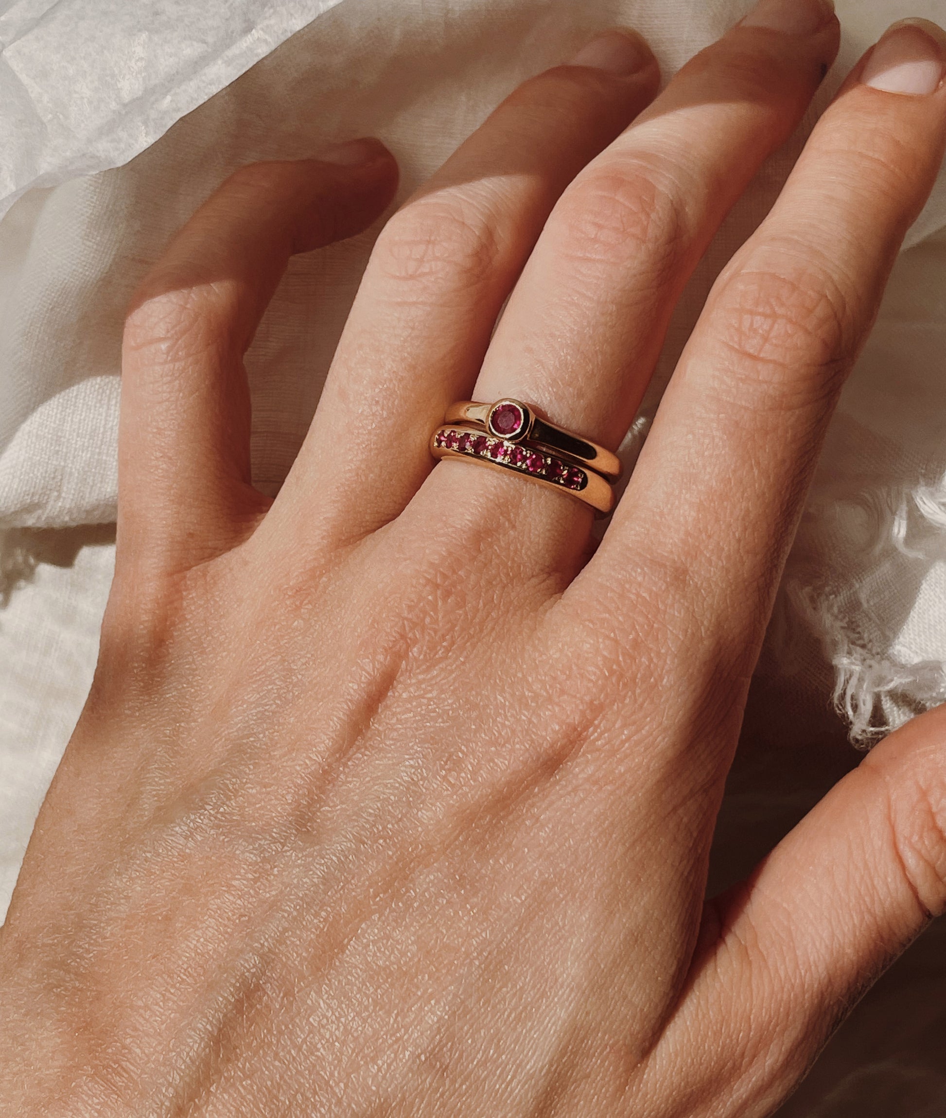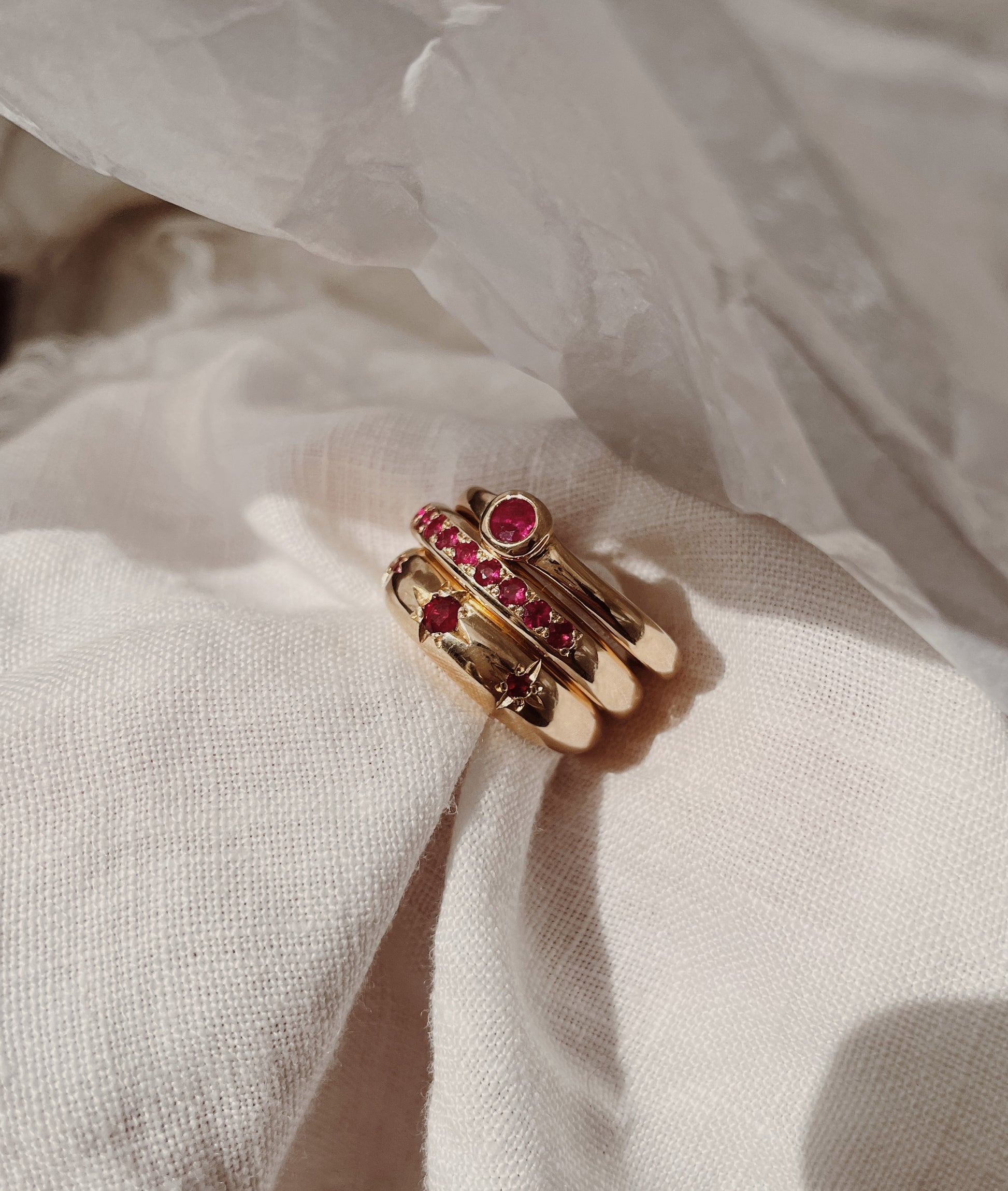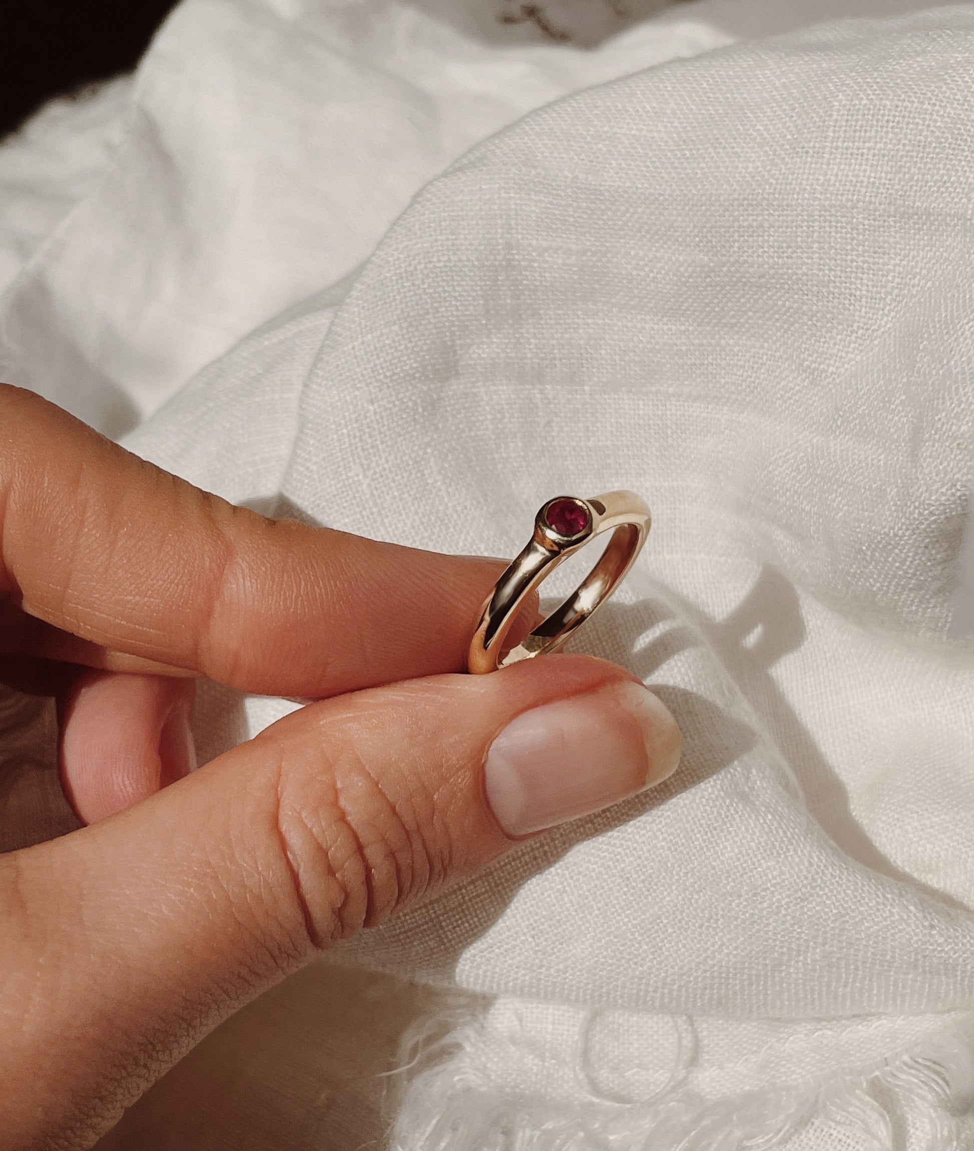 Hand carved Mini Solitaire ring in 9ct Yellow Gold, set with a round Ruby.