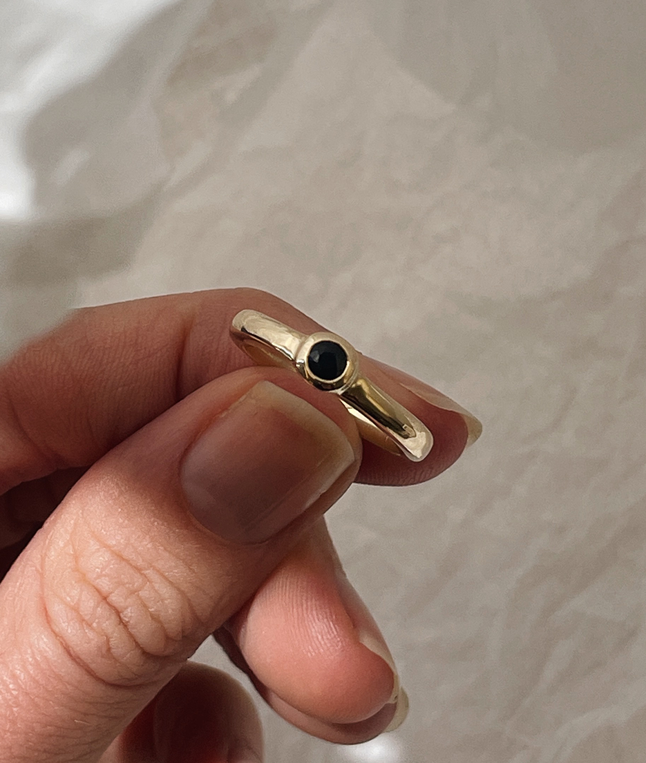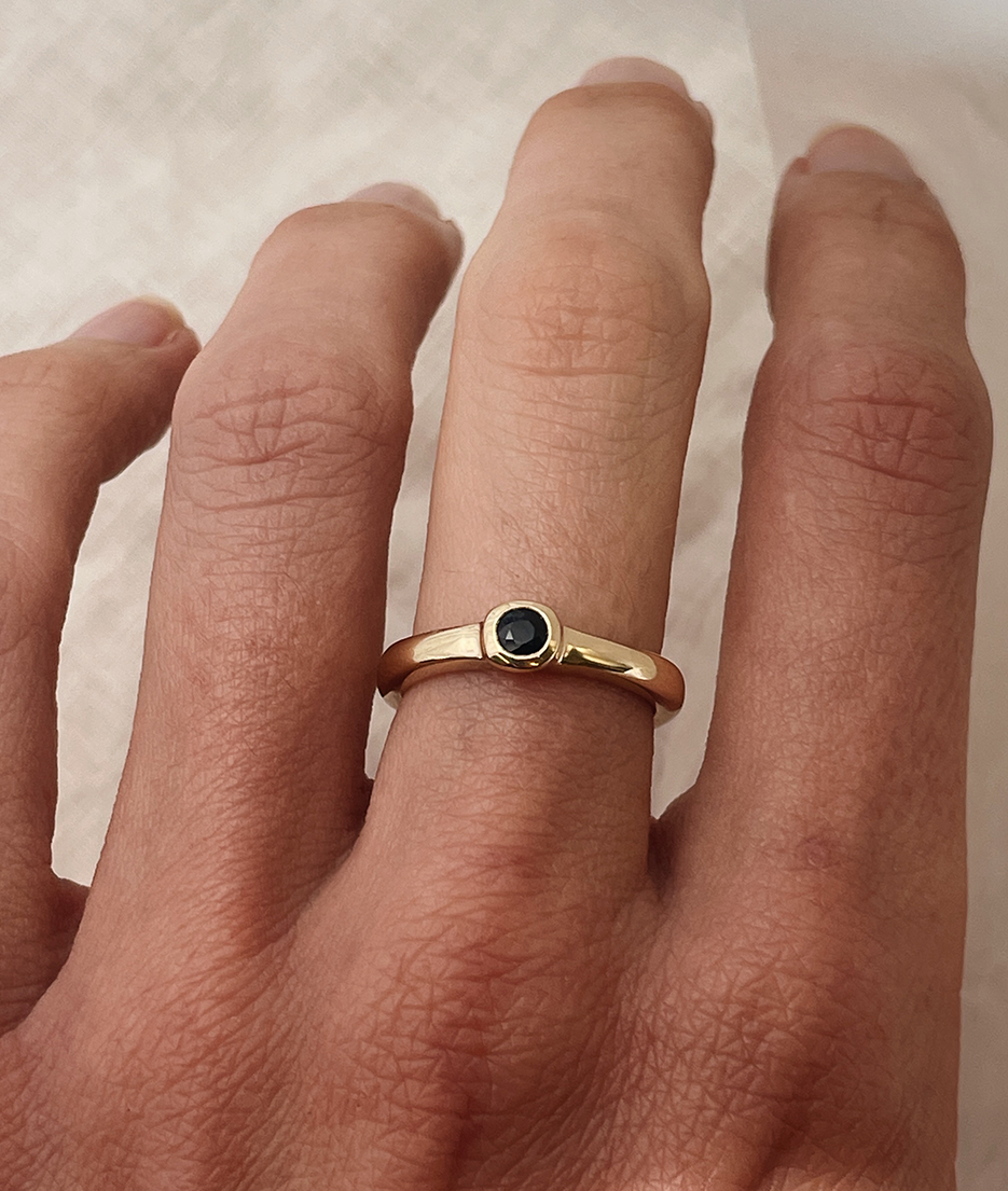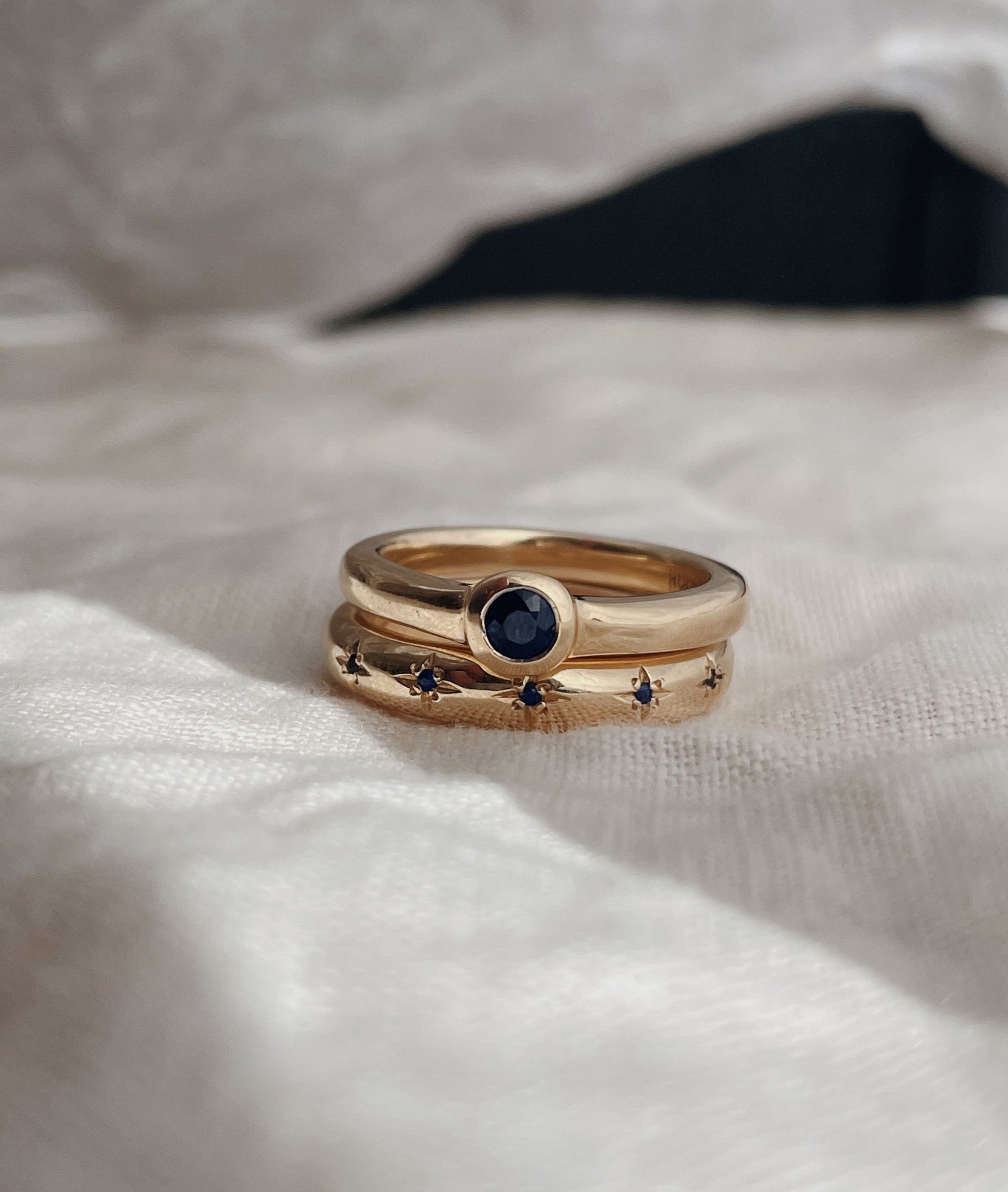 Hand carved Mini Solitaire ring in 9ct Yellow Gold, set with a round Navy Sapphire.