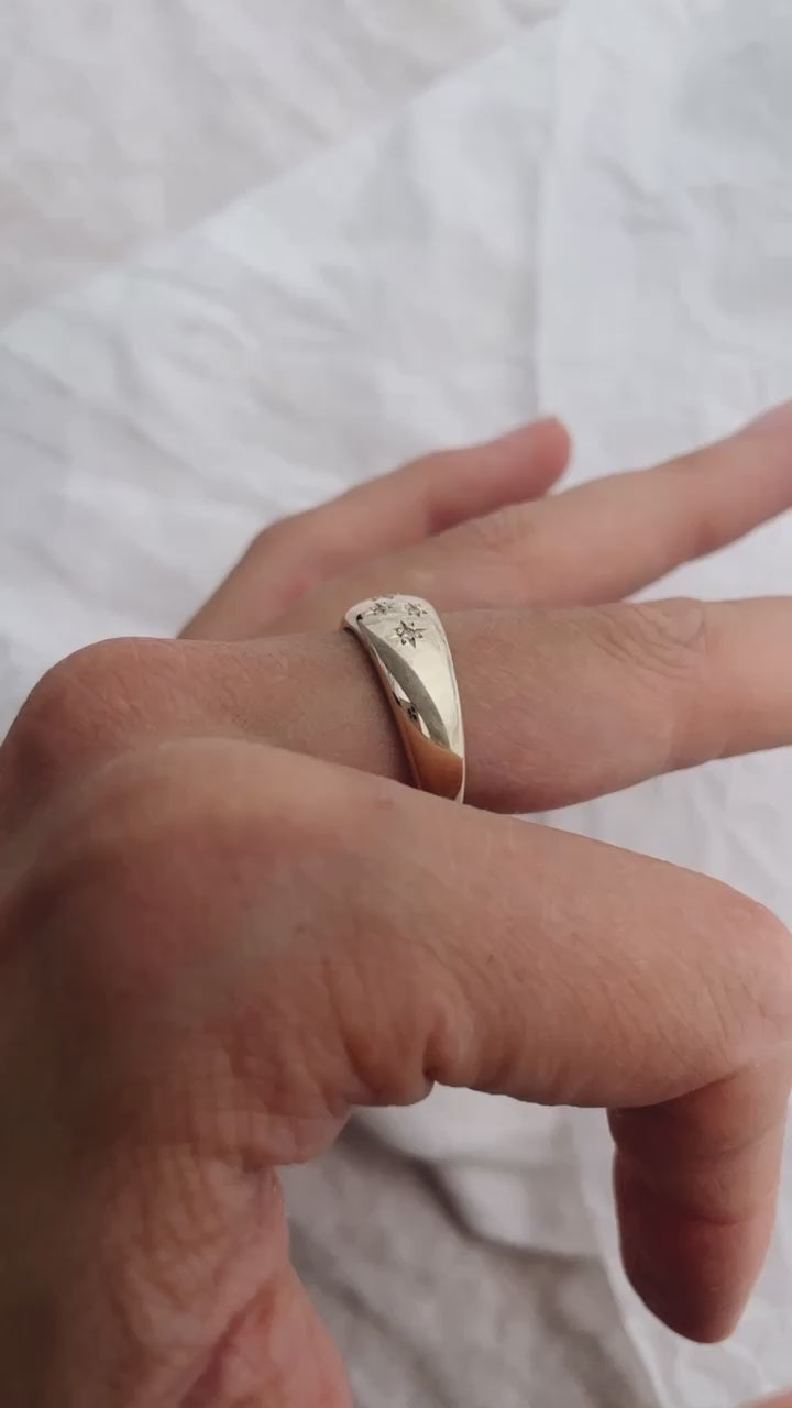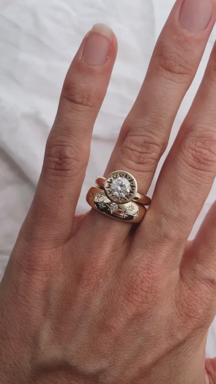 The widest of our tapered bands featuring a scattering of star set stones, hand carved and cast in solid Gold.