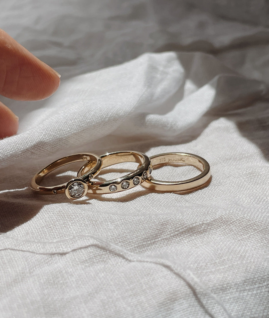A high polished finish, the most common finish on jewellery, makes the surface of a special piece very shiny and reflective. As all of our special pieces are designed for daily wear, your ring will gain some fine little scratches over time. The mirror-like finish will wear to a natural worn finish as it develops its own patina. However, this can easily be re-polished to return your piece to its original shine.