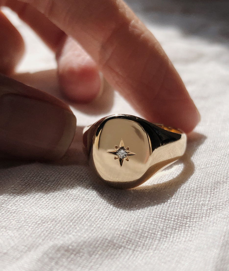 Hand carved Classic Large Signet, cast in solid Gold or Platinum, featuring a star set stone on the face of the Signet.