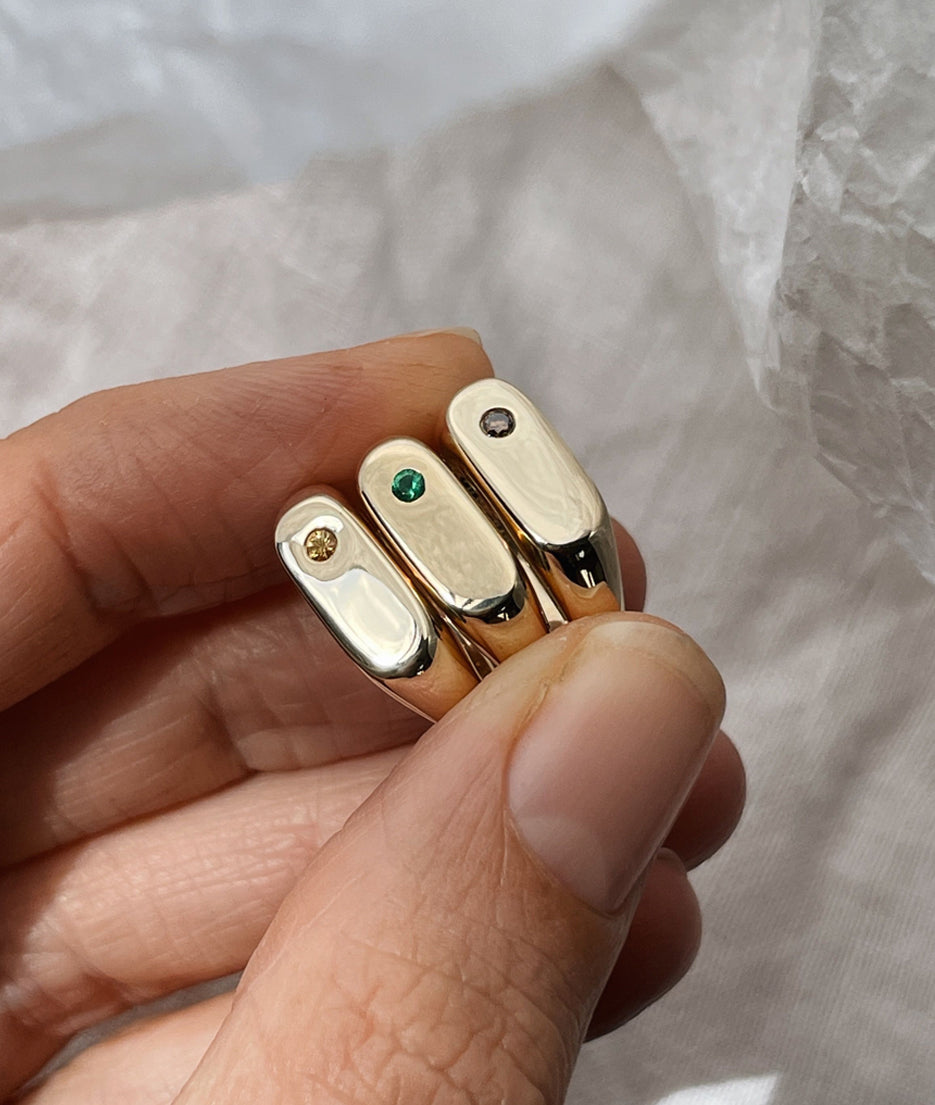 All of our pieces are made to order and we embrace and celebrate the subtle variations that make each item unique. Slight variations in band widths, thicknesses, and stone settings add to our organic style and are reflective of the hand finished nature of each piece