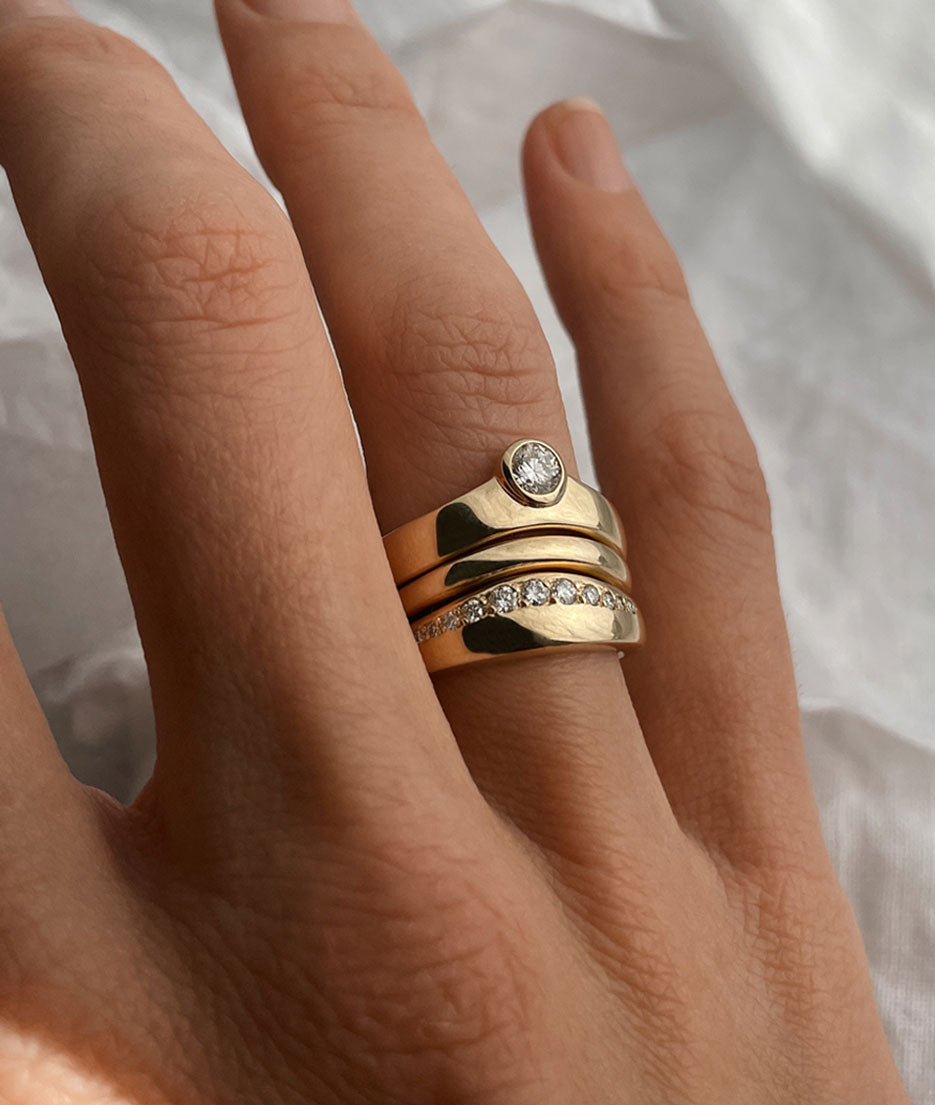 All of our pieces are made to order and we embrace and celebrate the subtle variations that make each item unique. Slight variations in band widths, thicknesses, and stone settings add to our organic style and are reflective of the hand finished nature of each piece