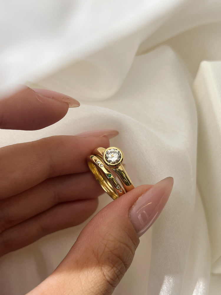 All of our pieces are made to order and we embrace and celebrate the subtle variations that make each item unique. Slight variations in band widths, thicknesses, and stone settings add to our organic style and are reflective of the hand finished nature of each piece